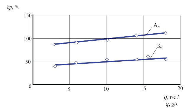 Графики Ам и Бм указывают на рост относительных потерь давления при увеличении расхода масла. С увеличением расхода масла от 3 до 18 г/с относительные потери давления в шланге А возросли от 88 до 112 %, а в шланге Б – от 45 до 54 %. Как видим, относительные потери давления в шланге со спиралью Б, витки которой находились ближе к стенке канала шланга, были почти в 2 раза ниже, чем в шланге со спиралью А.
