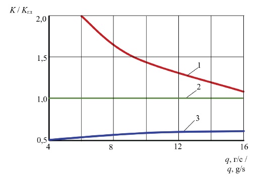 Используя данные с графиков Бк и Бг (см. рис. 8), по формуле (18) рассчитаем изменения величин K / Kгл пропускных способностей шлангов в интервале массового расхода 4 ≤ q ≤ 16 г/с. Результаты расчетов в виде графиков показаны на рисунке 9.