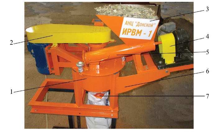 2. Fig 1. Experimental apparatus (general view): 1 – working chamber; 2 – rotor drive; 3 – load bunker; 4 – drive of the feeding screw conveyor; 5 – feeding screw conveyor; 6 – frame; 7 – unloading neck