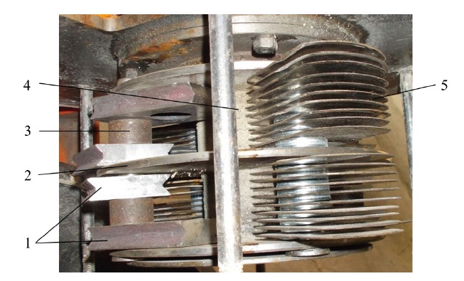 1 – hammers; 2 – disk; 3 – axis; 4 – shaft with a hub; 5 – knives