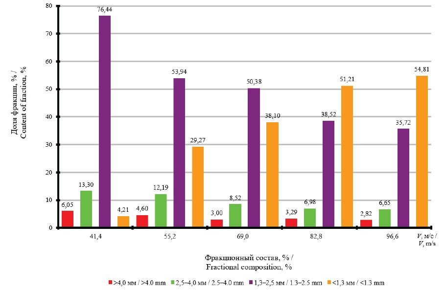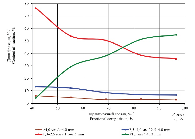 Анализ экспериментальных данных показывает, что при увеличении скорости ротора доля мелкой фракции (менее 1,3 мм) в основном возрастает за счет снижения содержания фракции 1,32,5 мм.