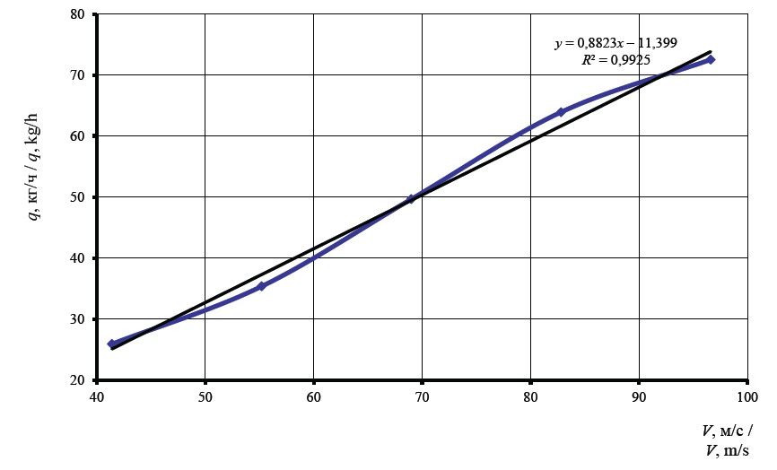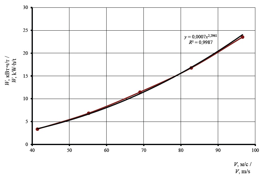 Как видно из графика (рис. 6), зависимость удельной энергоемкости измельчения от линейной скорости ножей ротора так же близка к линейной. Анализ этого графика показывает, что с точки зрения энергоемкости процесса оптимальный диапазон изменения скорости ножей для получения корма требуемого фракционного состава 55–65 м/с.
