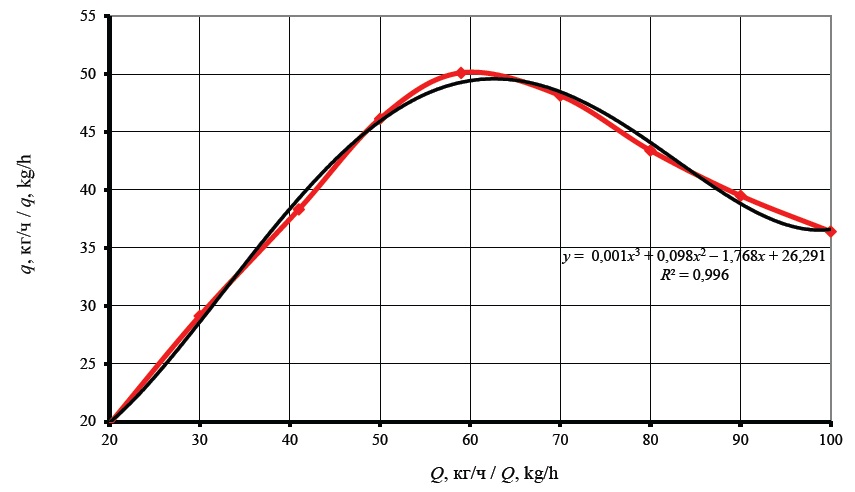 Рис. 7. Зависимость производительности измельчителя q от подачи сырья Q