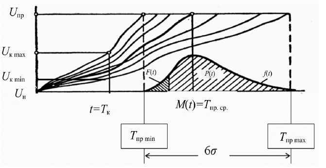 Если рассматривать партию аналогичных деталей, то величина накопленных повреждений (например, износа U) у каждой детали в момент контроля t = Tк (рис. 1) будет различная, и параметр состояния объекта Uк будет иметь различную величину в пределах Uк min < Uк < Uк max.