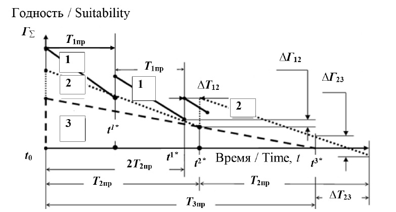Детали со сроком службы Т1пр могут заменяться несколько раз, при этом в момент t1* годность детали 2-й категории достаточно низкая и через промежуток времени ∆Т12 также откажет. Если деталь 1 заменить в этот момент, то придется в момент t2* снова проводить ремонтные работы.