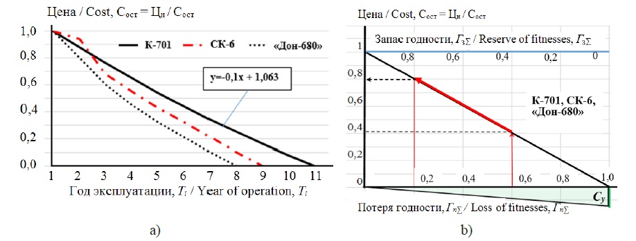 Для решения этой задачи была использована информация о наступлении предельного состояния сельхозтехники, при котором проводился ее капитальный ремонт на ремонтных заводах. На основании этой информации в свое время были разработаны отраслевые нормативы общего износа полнокомплектных машин в зависимости от сроков их эксплуатации (табл. 1). Остаточная стоимость машины рассчитывалась в зависимости от износа машины. Поэтому эти параметры в первом приближении можно графически представить на рисунке 3а.