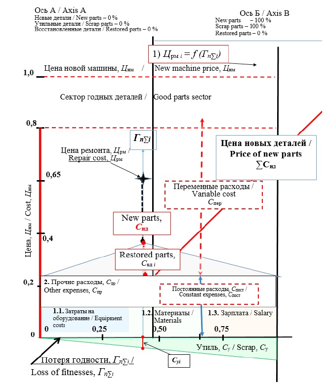 Получение информации такого рода позволяет разработать модель ценообразования при ремонте машины. Авторы данной работы, используя подход к определению технического состояния А. И. Селиванова, сформировали методику определения критерия, позволяющего обоснованно выбрать альтернативный вариант использования машины, достигшей граничного состояния: капитальный ремонт или утилизация.
