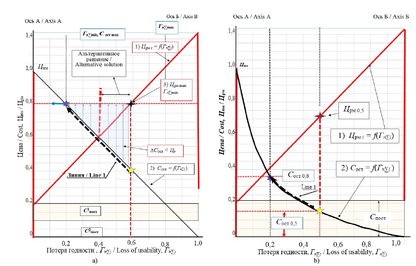Как показали исследования прошлых лет27 и исследования авторов в течение последних лет28, предельное состояние машины наступает при потере годности в интервале 0,45 < Гп∑i < 0,5. В этом интервале Гп∑i владелец машины может выбрать любой из двух вариантов дальнейшего ее использования: ремонтировать или утилизировать. При Гп∑i < 0,45 более предпочтительным является капитальный ремонт. При 0,45 < Гп∑i > 0,5 − утилизация, при которой будет обеспечиваться максимально возможное ресурсосбережение.
