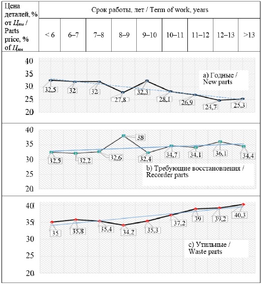 На рисунке 6 представлена информация о структуре деталей утилизированной сельскохозяйственной техники в процентах от стоимости машин при различных сроках их службы. Как видно из полученных результатов исследований, тренды изменения всех категорий деталей близки к линейному закону: тренд остаточной стоимости годных без ремонта деталей нисходящий, два других – восходящие.