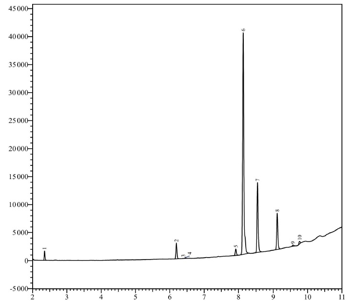 Жирокислотный состав образцов масел исследовался методом капиллярной газовой хроматомасс-спектрометрии на газовом хроматомасс-спектрометре производства Японии с масс-фильтром квадрупольного типа. Прибор был оснащен капиллярной кварцевой колонкой с полидиметилфенилсилоксановой неподвижной жидкой фазой. Относительное процентное содержание кислот в исследуемых маслах определялось по площадям хроматографических пиков соответствующих метиловых эфиров.