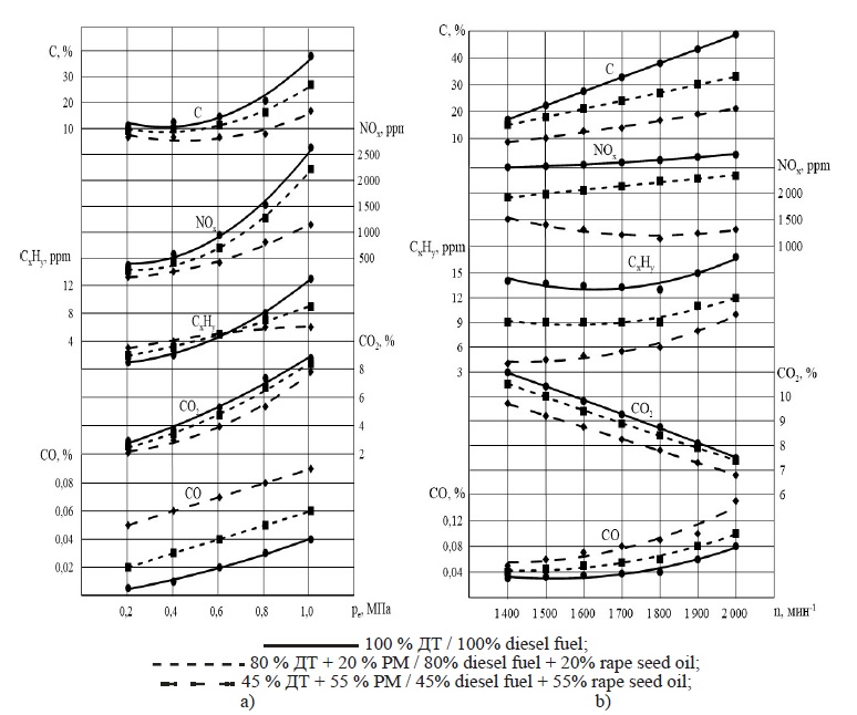 Fig. 4. Diesel engine environmental performance: a) at variable loading; b) at variable engine speed