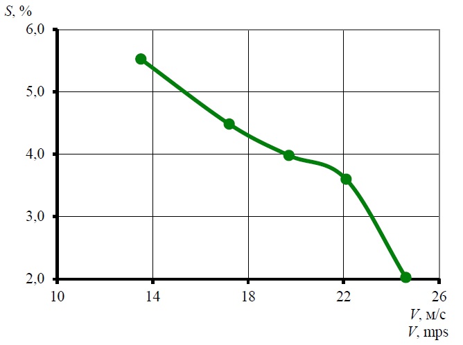 Было проведено 5 серий опытов, в каждом из которых при помощи частотного преобразователя устанавливали определенное значение частоты вращения ротора и, соответственно, линейной скорости движения лопасти. Частоту вращения ротора варьировали в диапазоне 402…732 об/мин (6,7…12,2 Гц), линейную скорость движения его лопасти соответственно изменяли в диапазоне 13,5…24,6 м/с. Каждый опыт осуществлялся в трех повторностях.