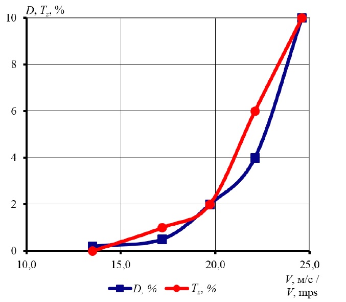 На рисунке 6 представлен график зависимости доли зерна с повреждением зародыша и доли дробленого зерна от линейной скорости лопасти при пневматическом обмолоте колосьев озимой пшеницы. Данный график показывает, что максимальные значения показателей повреждения зерна наблюдаются при максимальной линейной скорости движения лопастей ротора 24,6 м/с. При снижении скорости движения лопастей снижается и травмирование зерна. При минимальной скорости движения лопасти 13,5 м/с доля зерна с повреждением зародыша и доля дробленого зерна снижаются практически до нуля.