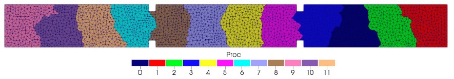 Построение параллельного вычислительного алгоритма основано на технологии для систем с распределенной памятью Message Passing Interface (MPI). Используя пакет METIS, было проведено геометрическое разбиение расчетной области на подобласти, количество которых равно количеству используемых процессоров (рис.1). В каждой области с использованием описанной численной схемы проводим расчет газодинамических параметров и концентраций веществ. Учитывая особенность построения вычислительного алгоритма, на каждой из подобластей дополнительно хранится информация о соседних ячейках (соседей по ребру), расчет в которых ведется на другом процессоре. Для определения граничных условий между соседними подобластями организован межпроцессорный обмен, для которого используем стандартные методы библиотеки Message Passing Interface CHameleon (MPICH), а именно парные блокирующие функции MPI_Send() и MPI _Recv(). Выбор данных функций обусловлен наличием обменов только между соседними подобластями. Каждый процессор выводит результаты расчетов в файлы XML-формата (VTU, PVTU). Визуализацию численных данных осуществляем с использованием открытого пакета Para View.