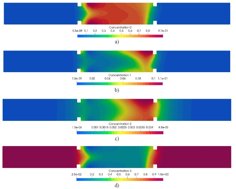 Fig. 2. Distribution of the mass fraction: a) ethane; b) ethylene; c) hydrogen; d) methane