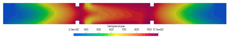 В таблице 1 представлена зависимость конверсии исходной газовой смеси, подаваемой в реакционную зону, от температуры нагревательных элементов. Можно сделать вывод о хорошем соответствии экспериментальных данных, ранее полученных результатов на структурированной прямоугольной сетке с использованием алгоритмов повышенного порядка точности [23] и результатов текущих расчетов. Из таблицы 1 видно, что при самой низкой и самой высокой температуре результаты текущего расчета на неструктурированной сетке дают завышенный результат по конверсии. Такое поведение можно объяснить первым порядком точности используемой численной схемы и погрешностью, которую вносит в схему использование неструктурированной сетки. Для достижения лучших численных результатов по исследованию газового потока с указанными начальными и граничными условиями необходимо уточнение геометрии реактора и использование в расчетах схем повышенного порядка точности.