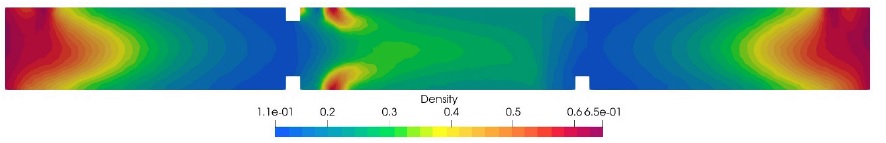 На рисунке 2 представлены распределения массовых долей основных компонент смеси: этана, этилена, водорода, метана. Из рисунков 2b, 2c видно, что концентрация целевых продуктов пиролиза, этилена и водорода, наблюдается в правой части зоны реакции и у нагревательных элементов, так как именно в этих областях температура газа (рис. 3) максимальна и, следовательно, химические превращения происходят наиболее интенсивно. Доля защитного газа метана (рис. 2d) максимальна в буферных зонах за счет постоянной его подачи через соответствующие вводы. Максимальная плотность (рис. 4) наблюдается в областях подачи газовой смеси и у торцевых стенок, так как газ по своим характеристикам близок к идеальному, и температура его в этих областях минимальна.