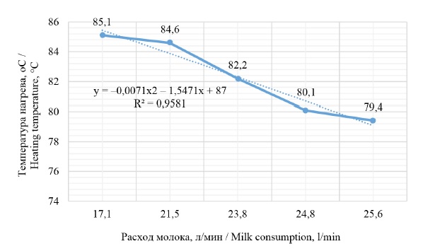 Динамика изменения более явно наблюдается в диапазоне значений от 21,5 до 24,5 л/мин, в дальнейшем динамика снижения замедляется. Требуемая температура пастеризации (82 °C) достигается при расходе молока 23,8 л/мин. Данный расход можно считать оптимальным для пастеризации молока при фиксированной площади теплообмена установки 2,23 м2 (вариант включения всех пластин секции). Указанная температура соответствует оптимальной температуре пастеризации, например, при производстве функциональных кисломолочных продуктов.