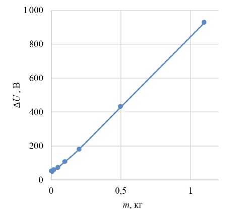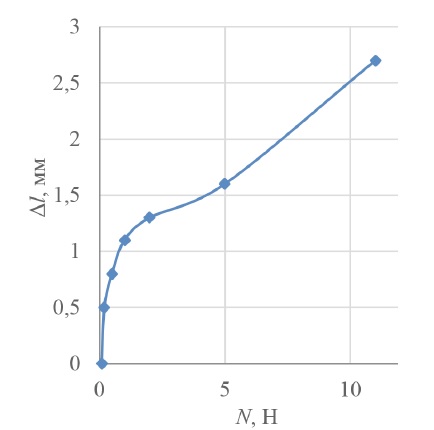 По данным таблицы 1 и результатам, подсчитанным по формулам (2), (5), построены графики Δl = f(N), ΔU = f(m), на основе которых можно получить классическую зависимость σ = Eɛ для полисиликона SP в момент удара (рис. 4‒6), где: – относительная деформация полисиликона; σ – нормальное напряжение в поперечном сечении относительно вертикальной оси образца SP.