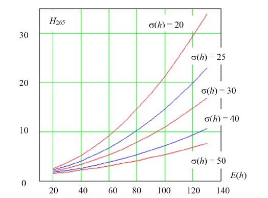 При использовании малоразрядных процессоров экономически выгодно применять таблицы преобразований с шагом записи данных 20 + 10 · i, где строчный индекс i меняется от 0 до 13 для математического ожидания расстояний Хэмминга E(h). Таблицы должны быть двухмерными, например, иметь 30 столбцов для значений стандартного отклонения σ(h), изменяющегося на единицу. В ячейках двухмерной таблицы должны лежать значения энтропии номограммы, отображенной на рисунке 1.