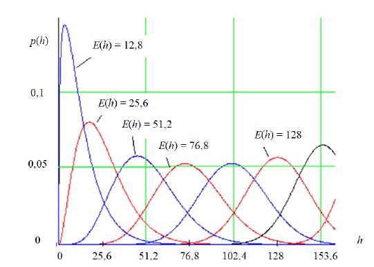 Из рисунка 2 видно, что при значениях математического ожидания  E(h)=12,8, E(h)=25,6 распределение расстояний Хэмминга становится существенно асимметричным [28; 29]. Это означает, что номограмма данных рисунка 1 при малых значениях математических ожиданий нуждается в значительных поправках DH256. Вычисление поправок выполняется путем нормирования расстояний Хэмминга, приводящего все возможные состояния к интервалу от 0 до 1. В итоге получается 8-разрядная двоичная таблица преобразований. Далее под заданное значение асимметрии подбираются два параметра бета-распределения. Уже в пространстве бета-распределений по формуле, аналогичной формуле (4), находится вероятность ошибок второго рода на 32-разрядной вычислительной машине: