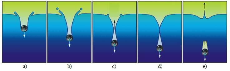 При падении шарика на поверхность воды образуется каверна – воздушное углубление. По мере углубления шарика в воду каверна растет, а затем на ней появляется перетяжка, которая разделяет каверну на воздушный пузырь, примыкающий к шарику, и коническое углубление на поверхности воды. Далее коническое углубление схлопывается и появляется кумулятивная струя, а воздушный пузырь вместе с шариком погружается либо отрывается от него и всплывает на поверхность воды.