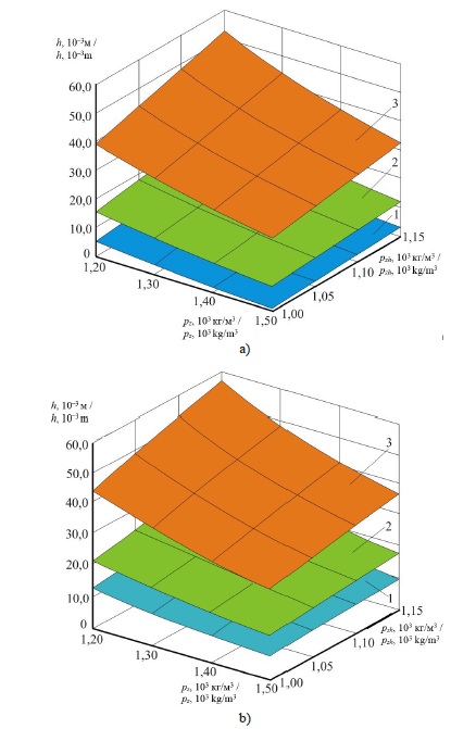 8. Fig. 7. Dependences of the minimum height of the outlet opening h of the loading hopper relative to the surface of the liquid on its density ρzh and density of the grain ρz: a) when the ellipsoidal grain is dropped into the liquid in the direction of the main major axis 2az; b) when the ellipsoidal grains fall into the liquid in the direction of the main minor axis 2cz (flat); 1 – with the maximum linear dimensions of the seed; 2 – with average linear sizes of the kernel; 3 – with minimum linear dimensions of the seed