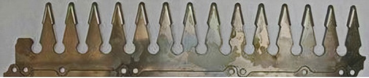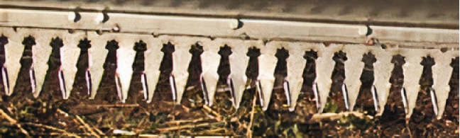 Известна очесывающая гребенка, устанавливаемая на серийной модели жатки Shelbourne Reynolds Engineering (рис. 3), у которой между рабочими поверхностями очесывающих элементов образованы технологические эллипсовидные отверстия, что способствует свободному протаскиванию очесываемого продукта и его стебля [12].