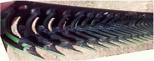 Параметры конструкции рабочего органа теоретически были определены: наклон зубьев гребенки относительно горизонтальной поверхности η = 24°, длина зуба lз = 0,072 м, ширина зуба bз = 0,021 м и межзубовое расстояние 0,032 м.