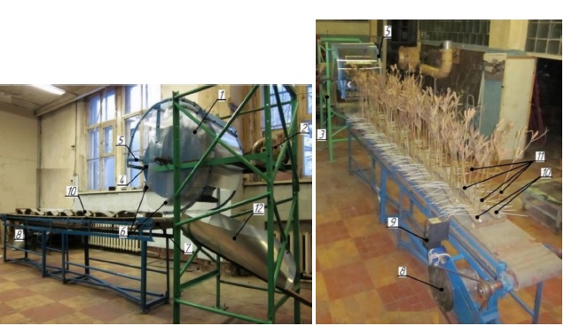 При проведении камеральных работ обрабатываемый материал 11 устанавливался в фиксаторе стеблестоя 10, закрепленном на подающем конвейере 7.