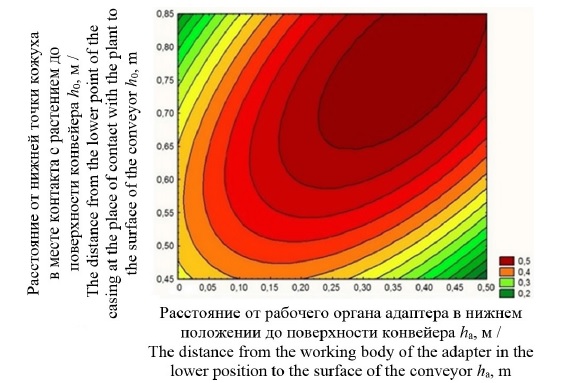 Показатель отношения окружной скорости ротора адаптера к поступательной скорости конвейера λ / The ratio of the peripheral speed of the adapter rotor to the translational speed of the conveyor λ | Расстояние от рабочего органа адаптера в нижнем положении до поверхности конвейера ha, м / The distance from the working body of the adapter in the lower position to the surface of the conveyor ha, m | Расстояние от нижней точки кожуха в месте контакта с растением до поверхности конвейера h0, м / The distance from the lower point of the casing at the place of contact with the plant to the surface of the conveyor h0, m | |