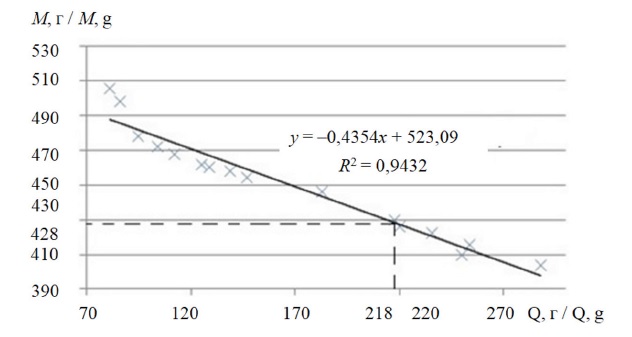 По значениям, полученным экспериментальным путем, методом наименьших квадратов получена линейная зависимость, описывающая корреляционную связь технического состояния тестоделительной машины по критерию расхода масла, обеспечивающего вакуум во всасывающей камере, и точностью развесовки массы тестовой заготовки. График представлен на рисунке 2.