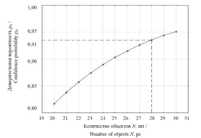 «Из графика на рисунке 3 видно, что для принятой односторонней доверительной вероятности pд = 0,80 количество объектов для проведения эксперимента равно N = 28 шт» [23].