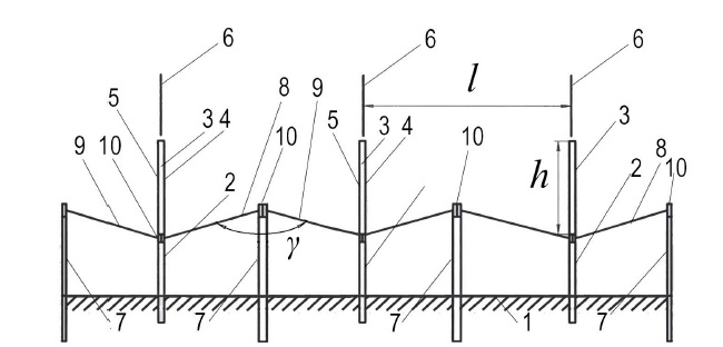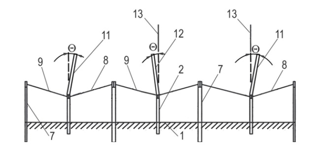 Отражатели солнечной энергии 8 и 9 закреплены по углам 10 на опорах 2 и 7. Расстояние между рядами двухсторонних СМ 3 и высота h двухсторонних СМ 3 связаны соотношением (1).