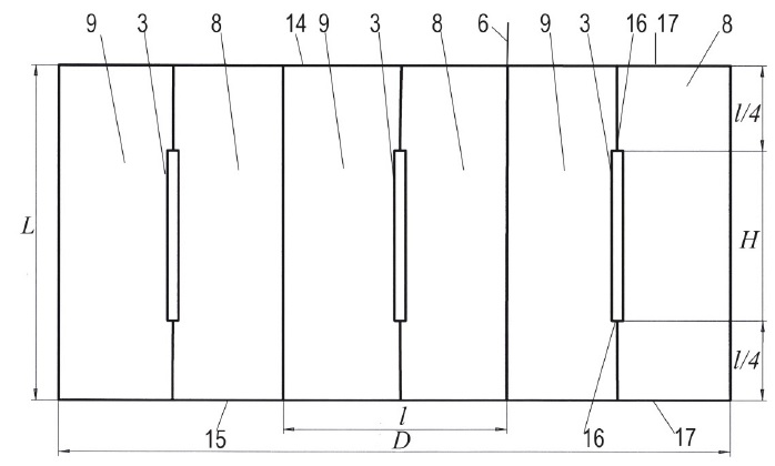 На рисунках 1–3 длина отражателей солнечной энергии 8 и 9 в меридиональном направлении 6 превышает длину двухсторонних СМ 3 в меридиональном направлении на D = . С северной 14 и с южной сторон СЭС расстояние между торцом 16 модуля 3 и краем 17 отражателей солнечной энергии равно .