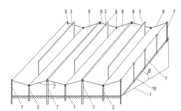 Двухсторонние СМ 3 установлены на склоне 18 холма на опорах 2 в меридиональной плоскости 6 в несколько рядов. Дополнительные опоры 7 установлены в меридиональной плоскости 6 на склоне 18 холма между рядами двухсторонних СМ 3. Отражатели солнечной энергии 8 и 9 установлены на опорах 2 и 7, как на рисунках 1–3.