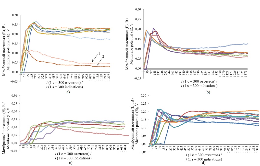 Экспериментальные исследования и теоретический анализ потенциала покоя показали, что зерна с высокой всхожестью представляют ритмические колебания с различной частотой и амплитудой. У зерен с низкой всхожестью уровень потенциала покоя лежит в узком диапазоне его изменений. Однако статистическое усреднение по группе зерен с одними и теми же аэродинамическими свойствами приводит к близкому результату (–5 мВ) независимо от сорта. Следовательно, уровень потенциала покоя не может быть характерным отличительным признаком различия зерен пшеницы по аэродинамическим свойствам и урожайности.