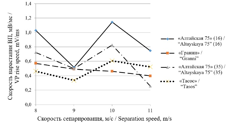 При сопоставлении зависимости массы 1 000 зерен от аэродинамических свойств у сорта «Гранни» обнаружен аномальный эффект. При скорости сепарирования 9 м/с масса 1 000 зерен меньше, чем масса 1 000 зерен при скорости сепарирования 8 м/с. Аномальные свойства проявляются при исследовании скорости нарастания ВП при скорости сепарирования 9 м/с (рис. 6) и при исследовании максимального значения ВП при той же скорости сепарирования 9 м/с (рис. 10). Уровень максимального значения ВП гораздо выше, чем у остальных сортов, что говорит о высокой концентрации ионов Na+.