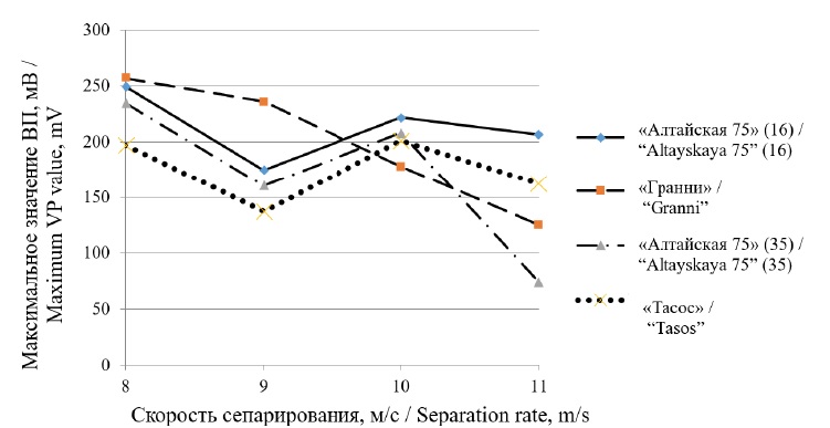 При скорости сепарирования 11 м/с наблюдаются значительные расхождения в максимальных значениях ВП у разных сортов. Зато в диапазоне от 8 до 10 м/с проявляются закономерности. В среднем максимальное значение ВП для зерен сорта «Алтайская 75» с урожайностью 16,4 ц/га выше, чем у зерен этого же сорта с урожайностью 35 ц/га. Формы графиков очень похожи. Следовательно, свойства оболочек идентичны. Большее максимальное значение ВП свидетельствует о большей концентрации ионов Na+ у зерен с меньшей урожайностью. Вероятно, что поле, засеянное этим сортом, имело большую концентрацию соли NaCl.