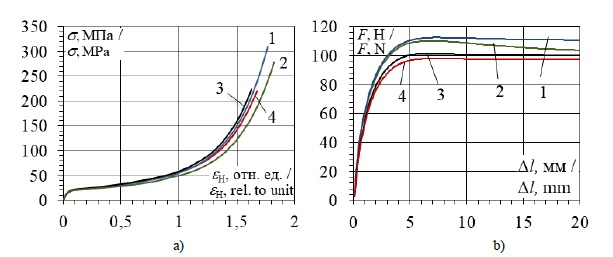 где l и l0 = 25 – значения текущей и рабочей длин образца, мм; А0 – начальная площадь сечения, мм2; F – текущее значение усилия растяжения, Н.