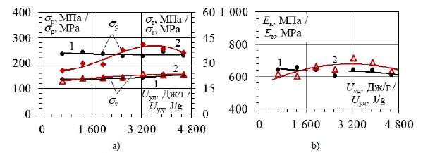 Fig. 2. Dependence of tensile strength σP and yield strength σT(а), final Eк elastic module (b) of