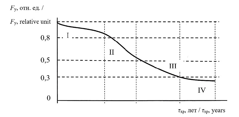 Между временем хранения подлежащей утилизации сельскохозяйственной техники и показателем утилизируемости существуют закономерные связи. Изменение показателя утилизируемости Fy в зависимости от срока хранения после списания τхр показано на рисунке 1.