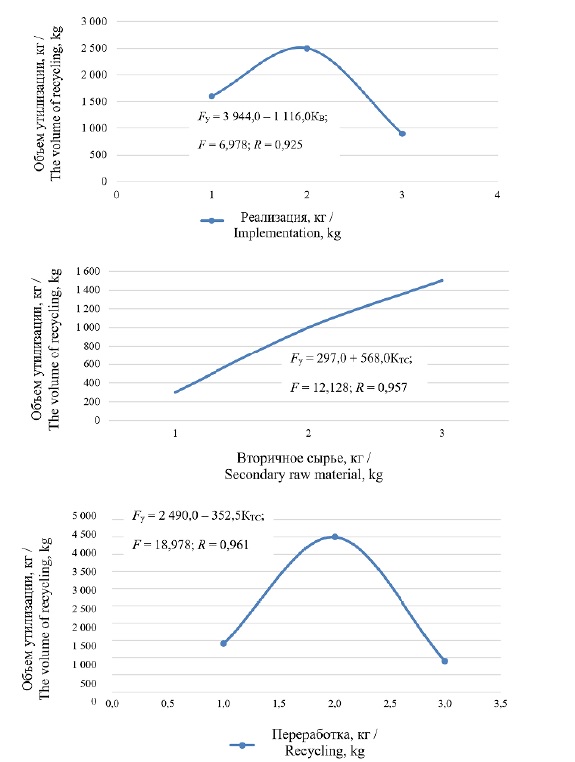 3. Fig. 2. Dependences of the recyclability rate on the technical condition of agricultural machinery КTC and the corresponding values of the correlation coefficient R and the Fisher criterion F