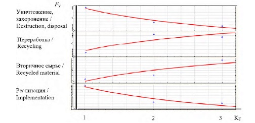 Между показателем утилизируемости и показателем сложности технического исполнения при проведении утилизации на разных этапах ее осуществления определены закономерные связи, представленные на рисунке 2.