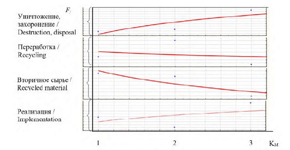 5. Fig. 4. Dependence of the recyclability rate on the material consumption and quantitative composition (volume of utilization) of agricultural machinery КМ: 1 – low volume; 2 – medium volume; 3 – large volume of recycling