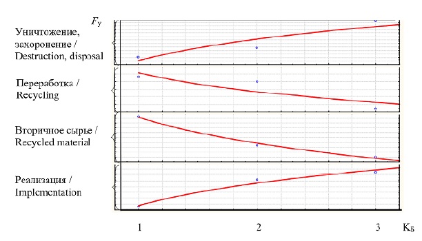 6. Fig. 5. Dependence of the recyclability rate on the safety index of materials КБ: 1 – low-risk; 2 – moderately dangerous; 3 – dangerous