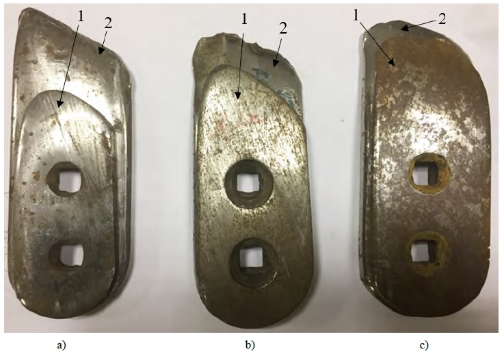 Fig. Comparative types of worn-out monometallic (1) and deposited two-layer (2) identical overhead