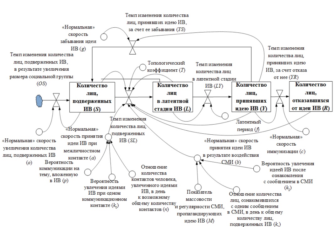 При этом системно-динамическая модель ИПД, являющаяся логическим развитием модели ИВ, учитывает характеристики забывания информации, существования латентного периода, изменения размера социальной группы, топологию взаимодействия в группе, замещения идеи ИВ идеей противоборствующей стороны.