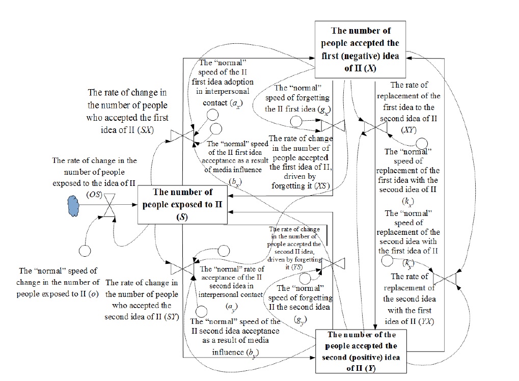 Построение системно-динамической модели ИПД связано с моделью ИВ на социальные группы. Предполагается, что в социуме одновременно идет распространение двух противоположных идей ИВ (положительной и отрицательной). Потоковая диаграмма, описывающая системно-динамическую модель ИПД, будучи представленной системой дифференциальных уравнений (4), приведена на рис. 2.