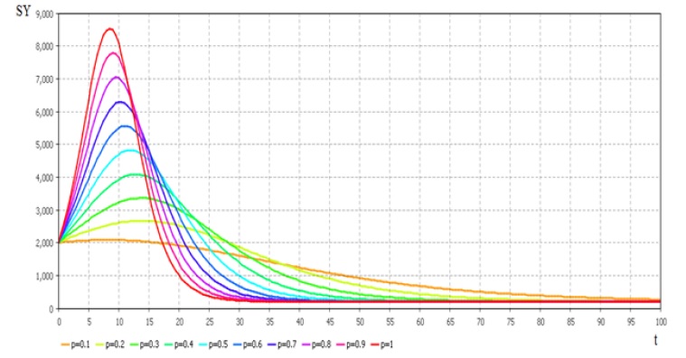 FIg. 3. The speed of acceptance of the II idea (SY) depending on the probability of communication on